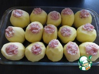 Подготавливаем бочонки из картофеля. Фаршируем полученным фаршем. Форму для запекания смазываем растительным маслом и ставим наш картофель |