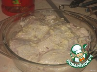 Курицу разрезать на порционные куски, обмазать маринадом и оставить на 2 часа для маринования. |
