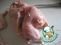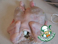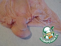 Снимаем с него чулком кожу. Это не очень легко, требует определенного навыка. Я это делаю рукой и ножом. Начинаю от хвостика: слегка надрезаю кожу, а потом аккуратно оттягиваю кожу от тушки. Где тяжело снимается, подрезаю жирок или мяско ножом, не повреждая кожу. Когда дохожу до лап, то надрезаю кожу в самом низу лапки и вынимаю ее из кожи. Крылья можно оставить вместе с кожей, так будет красивее.