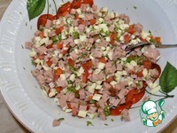 Нарезать мелкими кубиками колбасу, сыр и болгарский перец. Добавить рубленную зелень. |