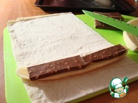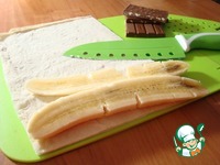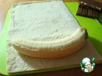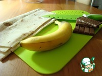 Кладём банан на лаваш и поверх банана выкладывае плитки шоколада, сколько поместится. |