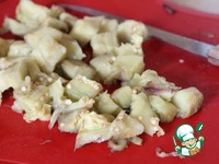 Баклажан переложить в посуду, пригодную для СВЧ. Готовить на мощности 850 Вт 5 минут до мягкости. Дать остыть. У баклажана снять кожуру, мякоть нарезать кубиками. |