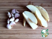 Картофель, не очищая, хорошенько вымыть щеточкой. Мелкий разрезать на две части, крупный - на 6-8 частей. Картофельные ломтики и дольки чеснока опустить в кипящую воду и варить до мягкости картофеля. |
