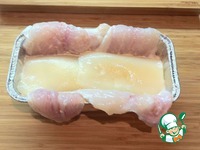 Для запекания я использую одноразовую форму из фольги размером 22*11 см. Ее можно не смазывать маслом. Выложить в форму филе пангасиуса так, чтобы края филе свисали по бокам формы. |