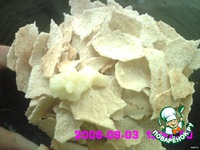 Хлеб поливаем горячим гороховым отваром,так что бы смочился весь хлеб и еще раз перемешиваем. Выкладываем горох и еще немного бульона –перемешиваем. |