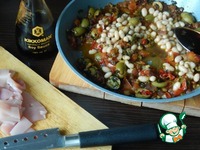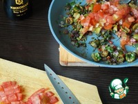 Затем на сковороду добавляем оливки, паприку и мелко порубленный чили, жарим еще 1-2 минуты. |