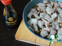Выкладываем сверху очищенные и порезанные кальмары. Накрываем крышкой и тушим еще 5 минут. |