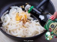 4. Добавить соевый соус, все перемешать. Для морепродуктов мне нравится использовать именно легкий соевый соус, он не перебивает, а только подчеркивает нежный вкус морепродуктов. |