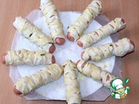 Выкладываем сосиски в тесте на смазанное маслом блюдо. Смазываем сверху взбитым желтком и ставим блюдо в СВЧ. |