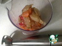 Готовую курочку вынимаем из пакета по прошествии времени. Овощи перекладываем в чашу и погружным блендером измельчаем наши овощи в пюре. |