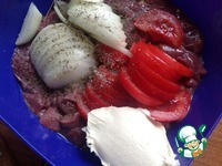 Печенку промыть, освободить от пленок. Я не стала резать ее. Посолить, добавить перчик, сметану и овощи. Все хорошо перемешать. |