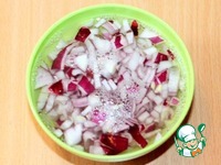 Залить красный лук кипятком, через 3 мин. воду слить. |