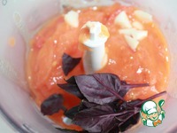 С помощью блендера измельчаем помидоры, чеснок и базилик. |