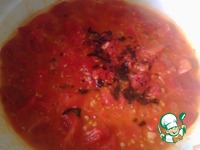Помидорки нарезаем и отправляем на сковородку. Добавляем мелко измельченный чеснок и базилик (у меня сушеный). Тушим под крышкой минут 5. |