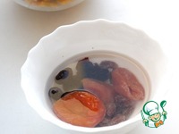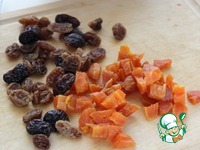 Замочить сухофрукты в воде. У меня курага, изюм, клюква. Это может быть и другая комбинация сухофруктов, на ваш вкус. |