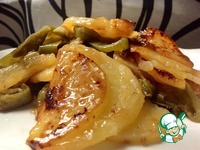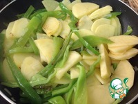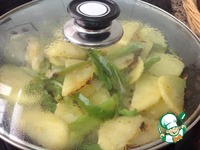 Жарить все овощи вместе на сильном огне. ВНИМАНИЕ: не солить и часто не мешать, чтобы картошка не развалилась! |
