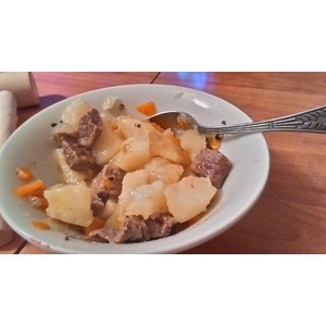 Мясо промыть, нарезать кубиками, лук и морковь также нарезать кубиками по 1 см, чеснок измельчить ножом. Выложить всё в чашу мультиварки. Если ваша мультиварка позволяет готовить блюда на пару в спец. контейнере, то картофель разрезаете вдоль на равные части. Кладёте картошку в этот контейнер и устанавливаете этот контейнер для приготовления на пару. Если такой контейнер отсутствует, то нарезаем картофель кубиками и кладёте с остальными ингредиентами в чашу мультиварки. Добавить в чашу мультиварки воду, масло, соль и специи по вкусу. Я добавляю только немного соли. Всё же ребёнку соли поменьше требуется. Перемешать, закрыть крышку, установить программу "Тушение" на 1 час, при температуре 100-130 градусов или программу "Мультиповар" на 1 час, при температуре 100 градусов.