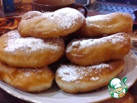 В сковороде с толстым дном раскалить масло, выложить пончики (чтобы они тонули в масле) и жарить под крышкой на среднем огне до золотистого цвета. Готовые пончики выложить на бумажные полотенца, чтоб лишнее масло стекло, потом посыпать сахарной пудрой.
