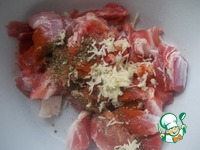 В срезанное мясо добавим соль, специи и измельченный чеснок. Перемешаем хорошенько. |