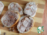 Описание: Очень аппетитная, вкусная и эффектная ветчина, к тому-же, с натурального продукта. Ведь всем известно, какое качество сейчас у магазинных, мясных деликатесов. Из рульки в свежем виде 1300 г, получается 600 г готового, холодного продукта. Готовим в духовке при маленькой температуре, за счет этого она просто тает во рту. За счет того, что в рульке очень много веществ для застывания, она прекрасно держит форму. Можно кушать и горячей, но я рекомендую остудить и тоненько порезать. Я добавляла еще прованские травы, но в ингредиентах их не отыскала.