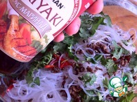 Выложить фарш в лапшу. Добавить соус Терияки от Kikkoman, сок лайма, чили и кинзу. |