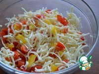 Перец красный и желтый нарезать на кусочки. Сыр натереть на крупной терке и смешать с перцем. |