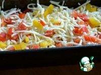 Форму хорошенько смазать подсолнечным маслом. Форма 22х10 Вылить наше тесто. Сверху выложить смесь сыра и перца. |