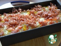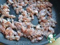 Печем в разогретой духовке 20 минут при 180 гр. Пока хлеб в духовке, на сковородке жарим бекон, нарезанный на кусочки. |