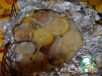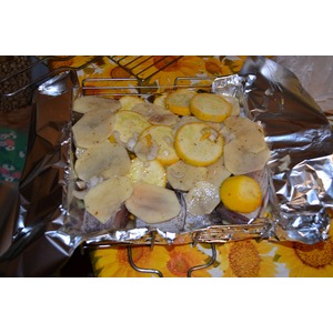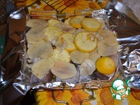 На решетку-гриль выкладываем нашу рыбку с овощами обязательно завернутую в фольгу. |