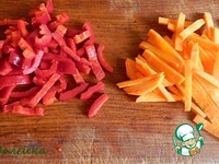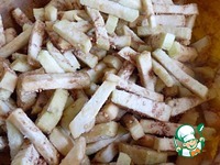 Баклажаны почистить, нарезать соломкой, залить водой с солью ( 500 мл. воды + 2 ст. л соли), дать настояться 30 минут. |