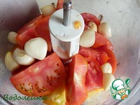 Измельчить помидоры и чеснок в блендере или на мясорубке. |