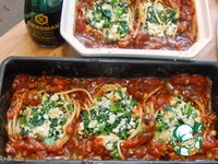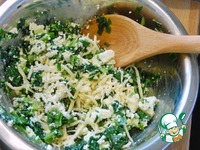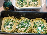 Когда вода для спагетти закипела, отправляем их целиком отвариваться, они должны стать гибкими, у меня варились примерно 4 минуты. Откидываем на дуршлаг. Дальше два варианта. Первый: быстро вилкой формируем из горячих спагетти гнезда 5шт. и выкладываем в подходящую посуду, так они будут липкими, и гнезда не будут разъезжаться. Второй: промываем спагетти холодной водой, а потом формируем гнезда при помощи вилки, спагетти не будут липнуть и будут немного расползаться при выкладывании. В цент гнезд укладываем сырную начинку. При укладывании я еще немного приподняла борта гнезд. |
