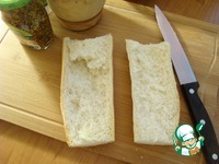 Багет режем на куски примерно 20 см и эти куски разрезаем пополам вдоль. Выкладываем багет в духовку на решётку минуты на 2, чтобы подсушить чуть и красиво зарумянить. Не пересушивайте!!! |