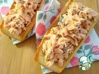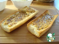 На подсушенный багет выкладываем заправку и размазываем тонким слоем или по вашему вкусу. |