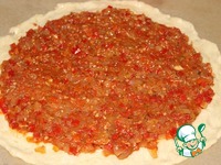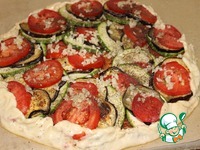 Раскладываем, чередуя, ломтики овощей на соусе так, чтобы они образовали спираль - от середины к краям теста. |