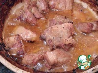 Духовку заранее нагреваем до 180 градусов, накрываем кастрюлю крышкой и отправляем на час в духовку. Так свинина будет выглядеть через 1 час. |
