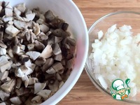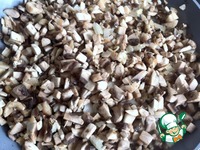 Обжарить на масле лук до прозрачности, добавить грибы и увеличить огонь. Готовим, помешивая, до испарения жидкости. |