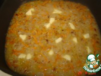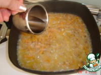 Обжарить мелко нашинкованный лук, добавить морковь натёртую на крупной тёрке, добавить рис, перемешать и минут 5 обжаривать помешивая. Влить воду. |
