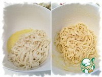 К яичной смеси добавить спагетти и хорошо перемешать. Посолить по вкусу не забывая о том, что мы используем два вида сыра, которые уже содержат соль. |