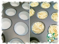 Равномерно распределить спагетти с яйцом по девяти формочкам. |