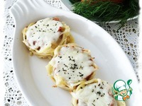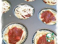 Каждую формочку со спагетти полить двумя ч. л. томатного соуса и сверху посыпать моцареллой. |