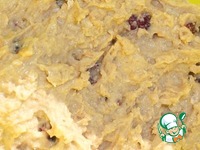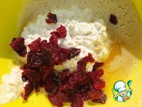 К яйцам и сахару добавляем хлопья с сметаной, вяленую вишню, перемешиваем. |