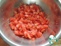 Тем временем в отдельную миску нарезать кубиком помидоры. Чеснок выдавить через чеснокодавилку, зелень порубить ножом. |