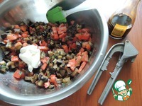Соединить баклажаны с помидорами, добавить чеснок, зелень, майонез и соевый соус. Аккуратно перемешать. |