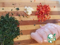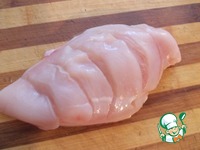 С грудки снять кожу, она нам не нужна. Порезать ее гармошкой, наискось. Но не до конца! |
