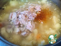 Вынимаем куриное мясо и забрасываем овощи, добавляем перец горошком и гвоздику. Посолить. Варим 15 минут до готовности картофеля. |