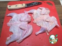 Цыплят моем, разрезаем со стороны грудки, обсушиваем бумажным полотенцем, слегка отбиваем кулаком (чтобы косточки похрустели), удаляем остатки шеи. |