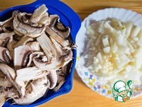 Затем добавляем к мясу лук, грибы и чеснок. Жарим ещё 2-3 мин. |