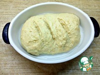 После того, как тесто поднялось, обмять, сформировать батончик, сделать надрезы и оставить подходить. Хлеб ничем не смазывала. Я использовала форму 26х20 см. |