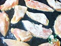 Кусочки грудки слегка посолить и запанировать в муке. Тщательно стряхнуть излишки муки и обжарить на растительном масле с двух сторон по паре минут. Выложить на тарелку. |